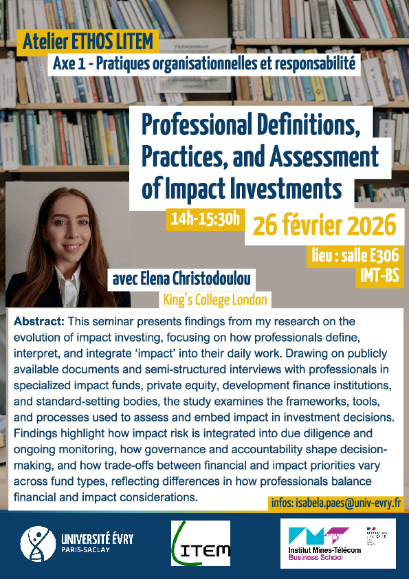 Nous avons le plaisir de annoncer le prochain séminaire LITEM/ETHOS, qui se tiendra le jeudi 26 février 2026, de 14h à 15h30, en salle E306 IMT-BS. Ce séminaire s’inscrit dans l’axe « Pratiques organisationnelles et responsabilité ».À cette occasion, nous accueillerons Elena Christodoulou, doctorante à King’s College London, pour une présentation intitulée Professional Definitions, Practices, and Assessment of Impact Investments.